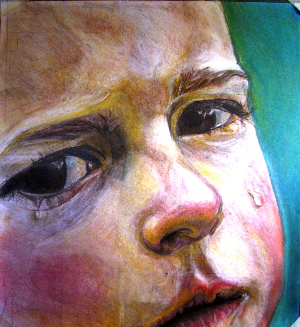 Illustration: ‘The Fall’, 40 x 40 cm, pastel and acrylic (from a photo taken of my friend’s daughter after she fell over. The photo was taken by her young friend)